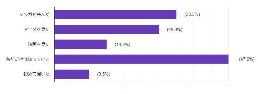 マンガ~映画までは重複して回答している人がいるので単純に合算できませんが、読んだり見たりしていない人は約半数。