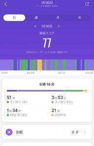 モニターできるのが、睡眠中の深い睡眠、浅い睡眠、REM睡眠、途中覚醒がすべて出る。