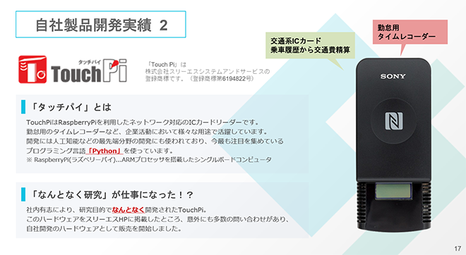 ” TouchPiとはラズベリーパイを利用し、felica等を使ってデータを記録するICカードリーダーです。言語は今AI技術で注目度の高いpythonを使用。こちらも先程と同じように社内で研究目的から始まった自社開発製品となります。3SではTouchPiの登録商標をもっています ”