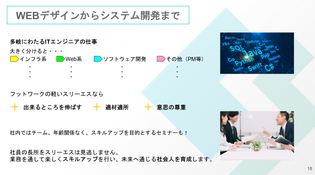 ブースに学生さんを迎えて1回のプレゼンはおよそ20分ほど。3Sの紹介とIT業界についてお話をしました。私が紹介したパートは以下の通り。