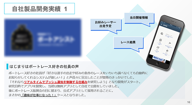 ” もともと社員からこういうのがあったらいいな という声からアプリの開発がスタートしています。簡単に説明するとボートレースの情報をリアルタイムでプッシュ通知して必要な情報を取得できるアプリです ”