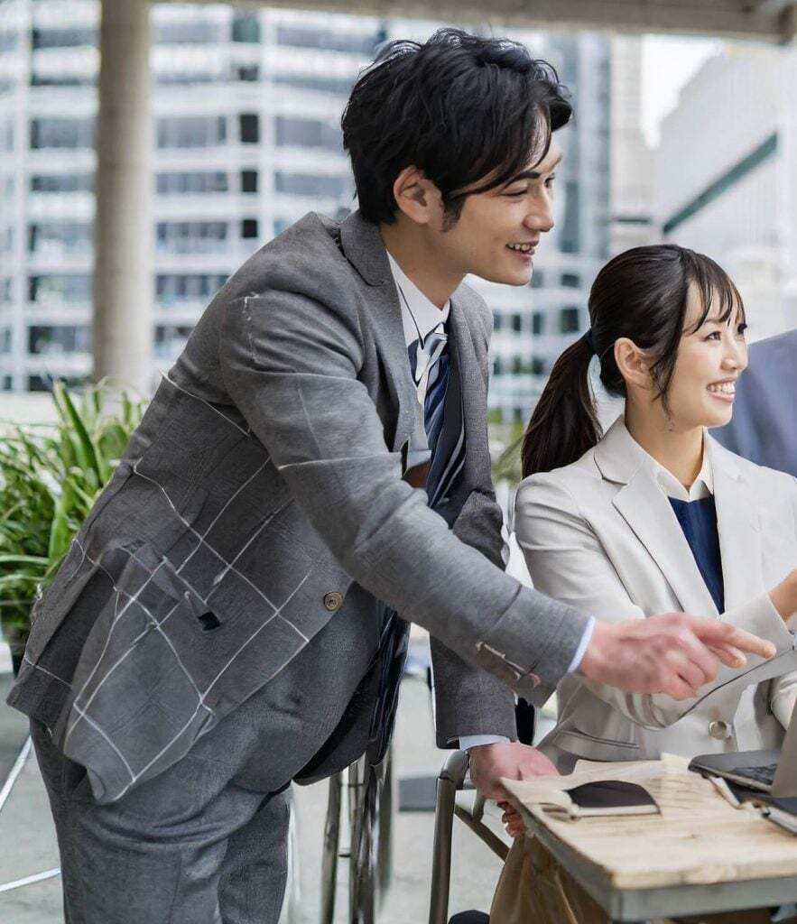 一人が空気イスなのか、背筋矯正用のバランス椅子なのか、床に座ったような感じですが、これが日本人のイメージなのでしょうか。