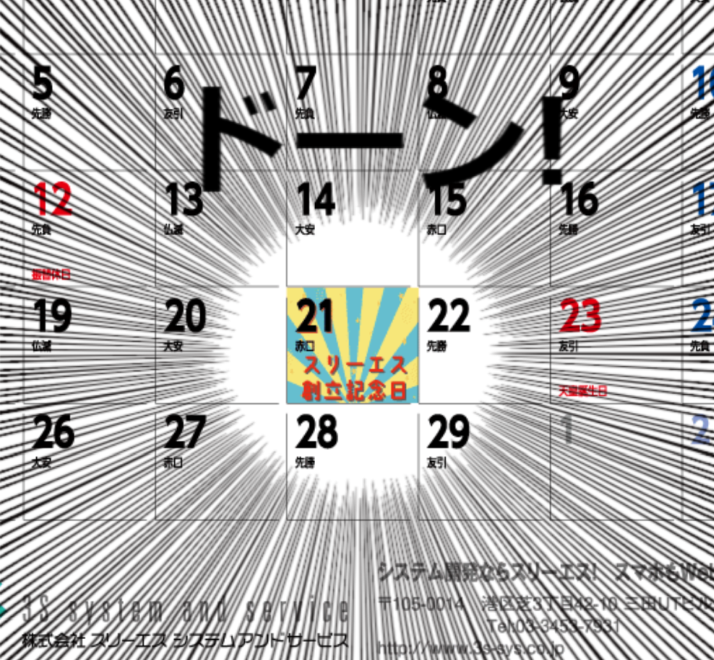 スリーエスの創立記念日も掲載されている完全オリジナルカレンダーです。