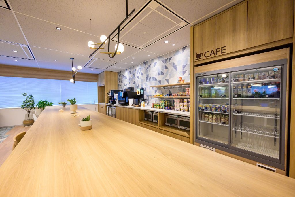 カフェエリアもあり、福利厚生価格でアルコールも購入できます。